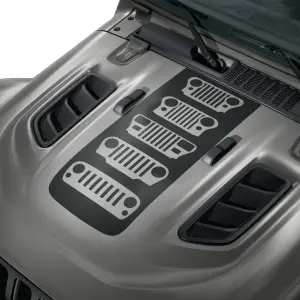 - Description: Hood graphic featuring multi-Jeep grille design. Graphic is low gloss black, vinyl material that is a wet adhesive application. Graphic fits Jeep Wrangler and Jeep Gladiator Rubicon hood.